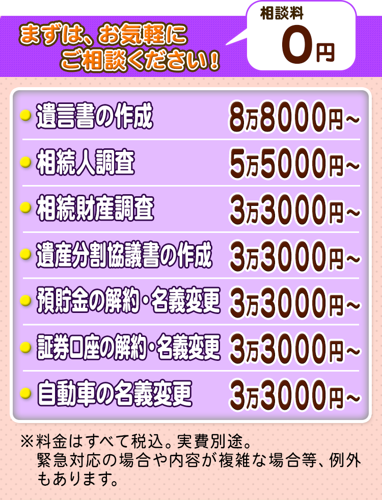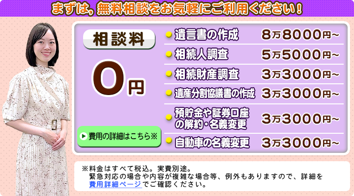 相続人や相続財産のご状況はお客様ごとに異なりますし、全ての手続きを依頼したい方、一部の手続きのみを依頼したい方など様々ですので、当法人では、無料相談にてご状況をお伺いし、ご契約前に、ご依頼いただく場合の費用の見積りを提示いたします。